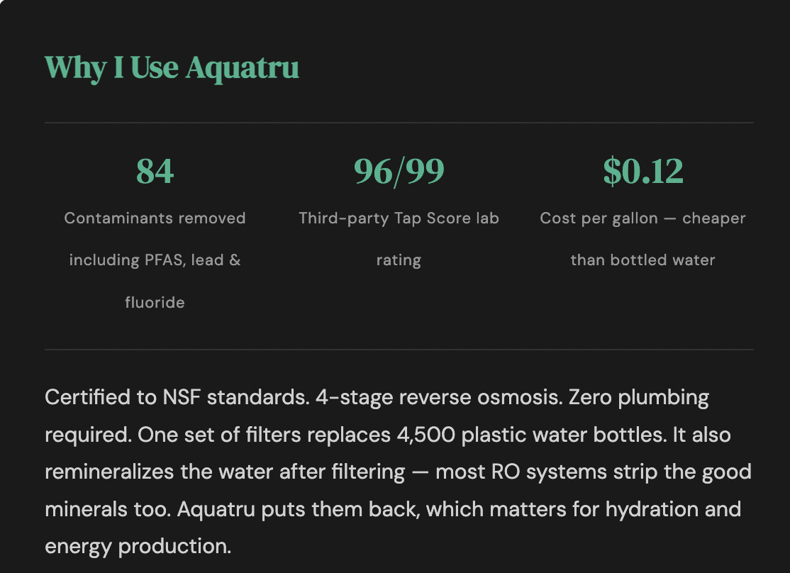 02. Filter your water. Get an RO system. Aquatru removes 84 contaminants, costs $0.12/gallon, and needs zero installation.