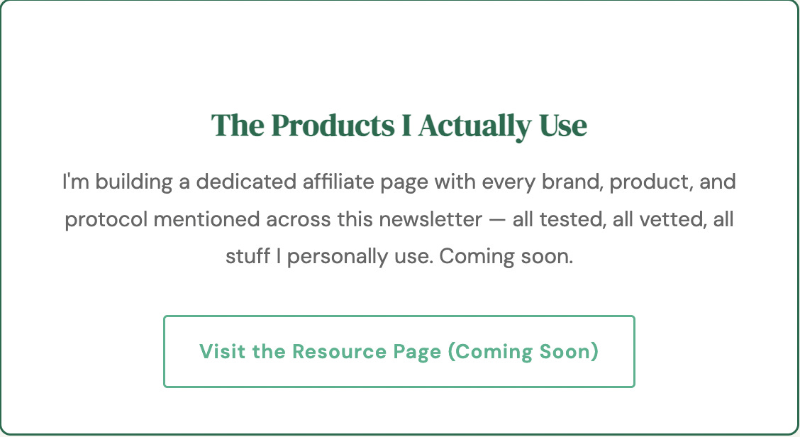 I’m building a dedicated resource page with every brand, product, and protocol mentioned across this newsletter — all tested, all vetted, all stuff I personally use. Coming soon. Check the homepage for more information.