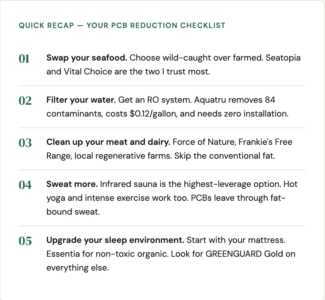 04. Sweat more. Infrared sauna is the highest-leverage option. Hot yoga and intense exercise work too. PCBs leave through fat-bound sweat.