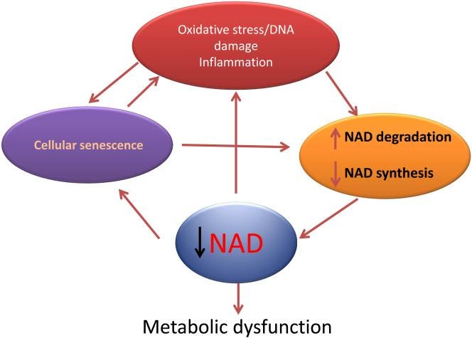Oxidative stress and inflammation can occur from chronic stress, environmental toxins, poor food, sleep, and drugs. Cellular senescence occurs when cells do not divide properly, stay as a cell, and do not induce apoptosis, invading other cells and causing stress. Metabolic dysfunction is when your blood sugar is all over the place, damaging your body from AGEs (advanced glycation end products), rampant inflammation, and a whole host of issues. Also to note, as you get older, your NAD+ levels naturally decline, and by age 50, you have about half as much NAD+ as your child self.